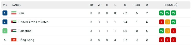 ĐT Iran đã không khiến người hâm mộ thất vọng khi thể hiện sức mạnh của ứng viên cho chức vô địch. Đoàn quân của HLV Amir Ghalenoei giành ngôi nhất bảng với trọn vẹn 9 điểm. Trong khi đó, UAE đi tiếp với tư cách nhì bảng (4 điểm). Palestine dù cũng có 4 điểm nhưng xếp thứ ba vì thua kém về mặt hiệu số.