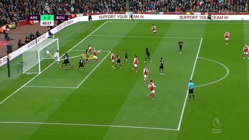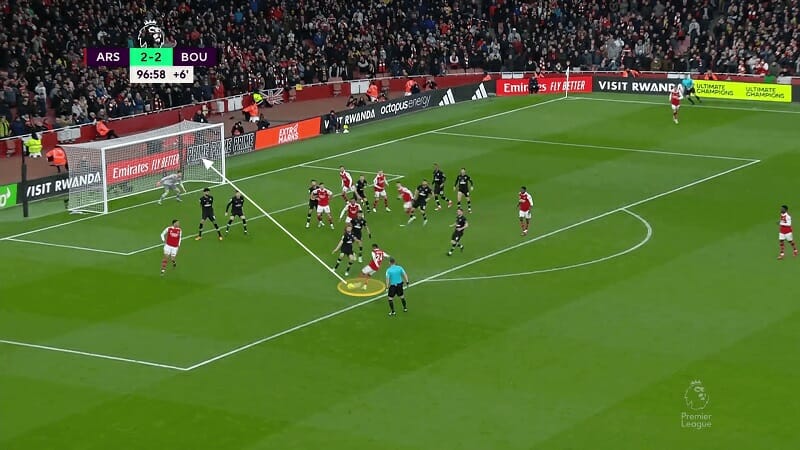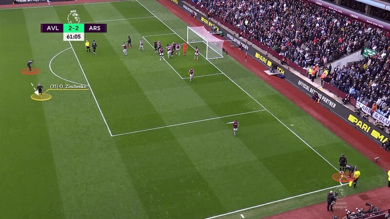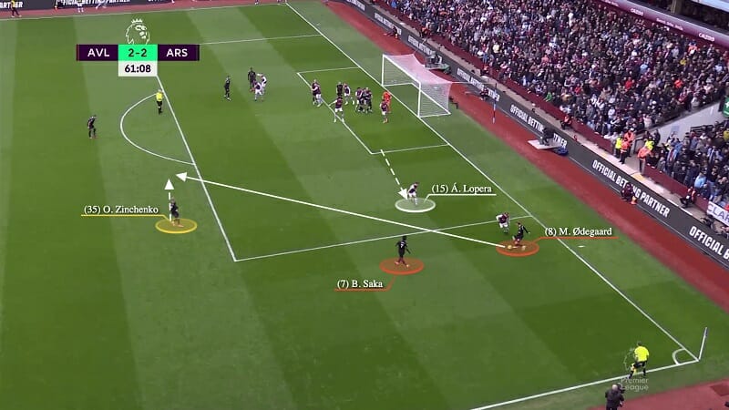 Trở lại trận đấu giữa Aston Villa và Arsenal vào ngày 18/2. Phút 61, tập thể thành London được hưởng phạt góc bên cánh phải. Ben White (vòng tròn đỏ) và Oleksandr Zinchenko (vòng tròn vàng) có mặt ở phía ngoài, trong lúc toàn bộ cầu thủ đội chủ nhà đều đứng dưới chấm penalty.