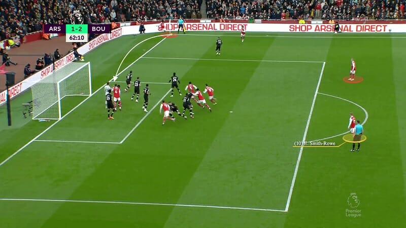 Ở phía cột cờ, ban đầu chỉ một mình Philippe Coutinho đảm trách nhiệm vụ ngăn cản Martin Odegaard và Bukayo Saka phối hợp ngắn. Thấy thế, Alex Moreno tiến ra để hỗ trợ đồng đội.
