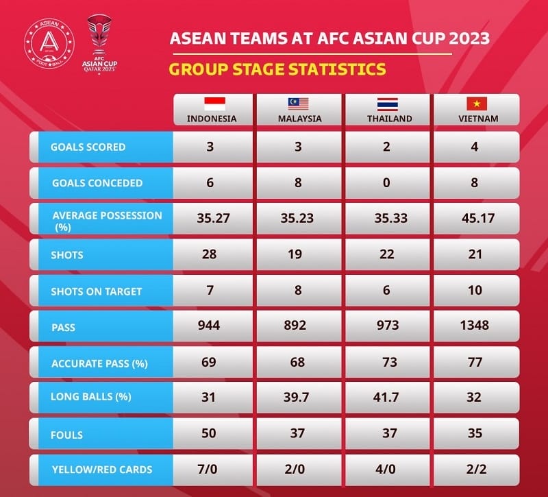 Dù vậy, theo thống kê từ trang ASEAN FOOTBALL, ĐT Việt Nam đã có màn trình diễn không quá tệ tại Asian Cup năm nay. Theo đó, đoàn quân của HLV Philippe Troussier dẫn đầu các đội Đông Nam Á ở nhiều thông số đáng chú ý như số bàn thắng ghi được (4 bàn), số cú sút trúng đích (10 pha dứt điểm).