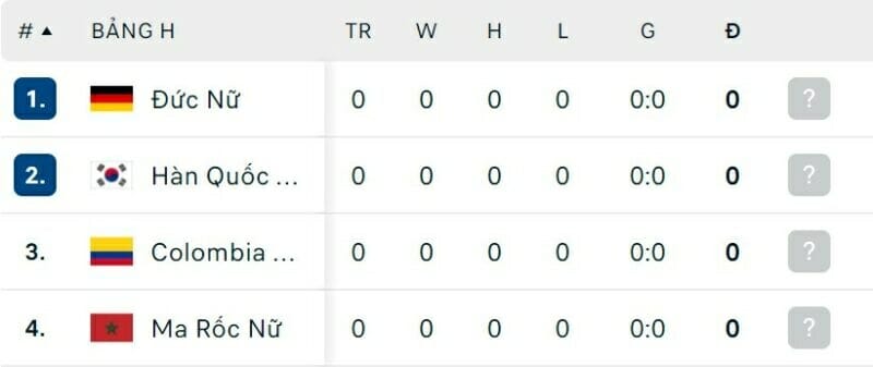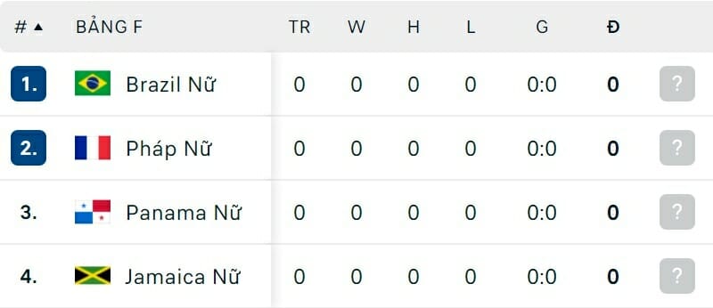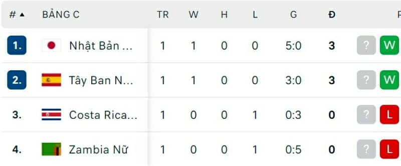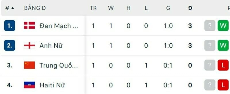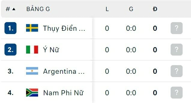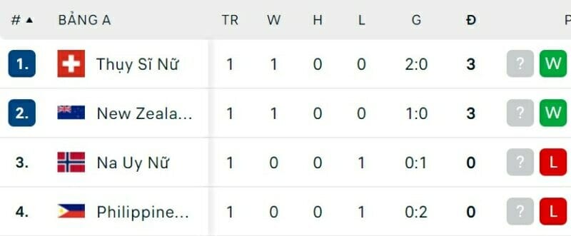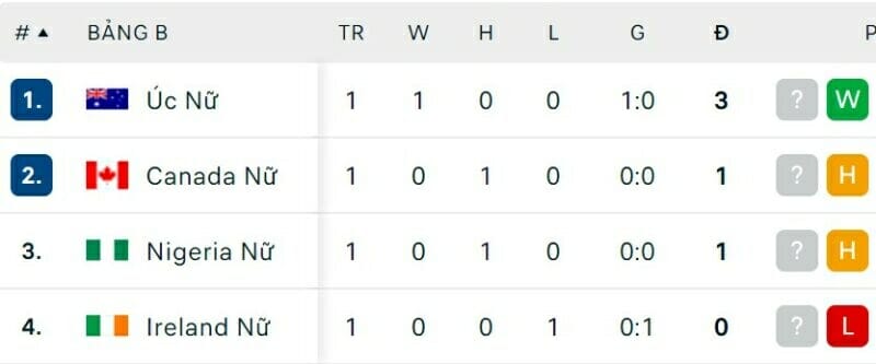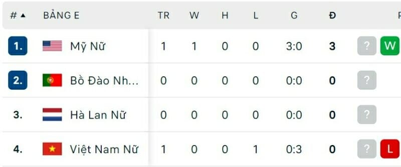 One Goal News cung cấp bảng xếp hạng World Cup bóng đá nữ hôm nay ngày 23/07. Trận đấu còn lại của bảng có sự xuất hiện của nữ Việt Nam là nữ Hà Lan vs nữ Bồ Đào Nha sẽ diễn ra vào hôm nay.