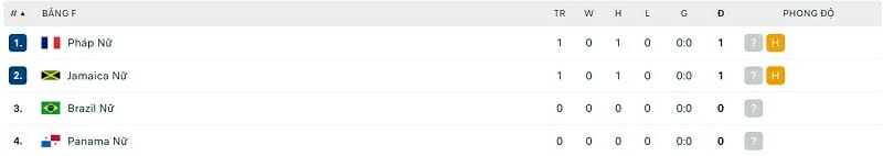 Ở loạt trận gần nhất, Bảng F đã chứng kiến một bất ngờ lớn. Trong ngày ra quân tại World Cup nữ 2023, ứng cử viên cho chức vô địch là ĐT nữ Pháp lại chỉ có được kết quả hoà không bàn thắng với Jamaica. Đây rõ ràng là kết quả khiến đoàn quân của HLV Herve Renard không thể hài lòng và họ sẽ cần có những bàn bạc để cải thiện lại khâu tấn công của mình. Ở vòng sau, ĐT nữ Pháp sẽ phải đối đầu với một thử thách thật sự là Brazil, nhà đương kim vô địch của bóng đá nữ Nam Mỹ.