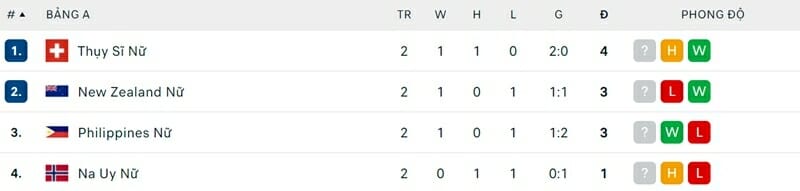 ĐT nữ Thụy Sỹ đã hòa ĐT nữ Na Uy 1-1, một kết quả giúp Gresshoppene chưa bị loại khỏi giải đấu. ĐT nữ Na Uy về lý thuyết vẫn có cửa đi tiếp nếu đánh bại ĐT nữ Philippines ở lượt cuối. Với việc đội đầu bảng chỉ hơn 2 đội xếp sau 1 điểm, tình hình bảng A có thể đảo chiều sau lượt thứ 3.