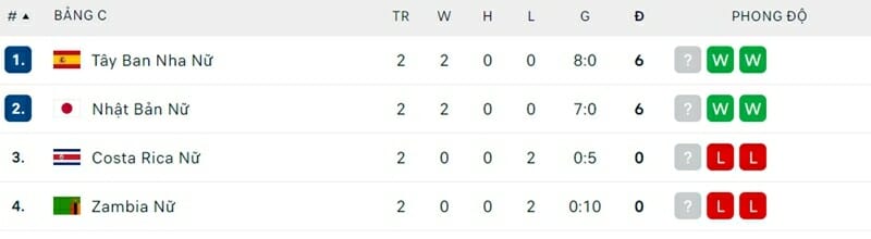 One Goal News cung cấp bảng xếp hạng World Cup bóng đá nữ hôm nay ngày 26/07. ĐT nữ Nhật Bản và ĐT nữ Tây Ban Nha sớm giành vé vượt qua bảng C.