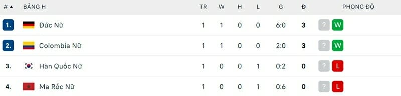 Nối gót ĐT nữ Đức, ĐT nữ Colombia đã giành 3 điểm đầu tiên. Họ vượt qua ĐT nữ Hàn Quốc với tỷ số 2-0 do công của Maria Catalina Usme Pineda và Linda Lizeth Caicedo Alegria. Lượt thứ 2 bảng H hứa hẹn căng thẳng khi 2 đội đầu bảng chạm trán nhau.