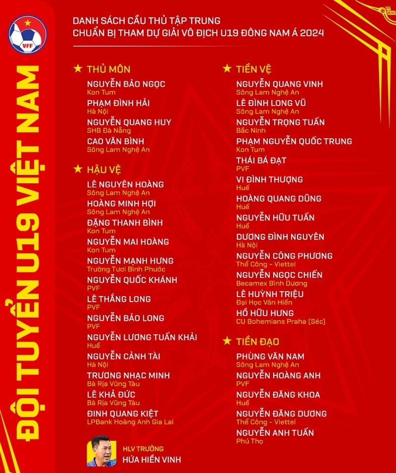 HLV Hứa Hiền Vinh đã chính thức công bố danh sách 35 cầu thủ U19 Việt Nam chuẩn bị cho giải U19 Đông Nam Á 2024.