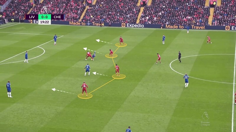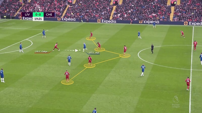Trong tình huống này, Gakpo di chuyển ngược lại từ vị trí tiền đạo cắm để cướp bóng trong chân Lewis Hall bên phía Chelsea.