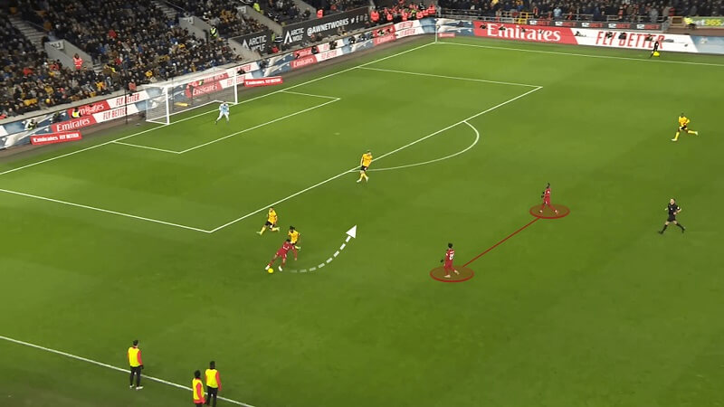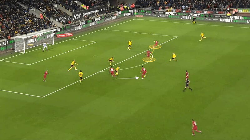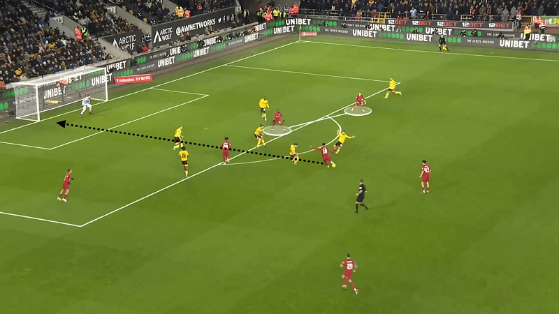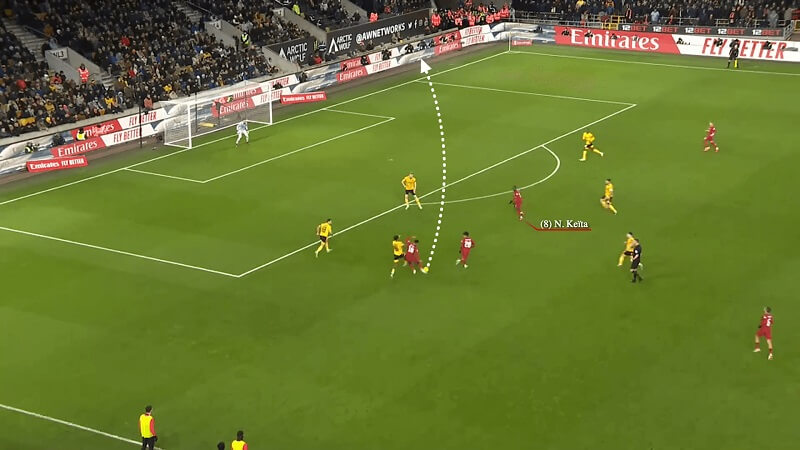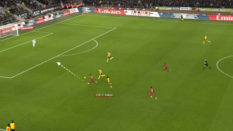 Trước Wolverhampton Wanderers ở trận đá lại vòng 3 FA Cup, không thiếu khoảnh khắc Gakpo cố gắng thử vận may dù đồng đội đứng tại vị trí thuận lợi. Như trong pha bóng dưới đây, ngôi sao sinh năm 1999 hoàn toàn có thể chuyền lên cho Naby Keita thay vì sút xa.