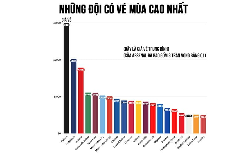 Còn nếu tính vé mùa, thì Fulham là đội khiến khán giả ‘xót ruột’ nhất nhất khi phải bỏ ra tới 3.000 bảng cho 19 trận. Xếp sau họ là 2 đội bóng thành London khác, Tottenham và Arsenal. Đây cũng là điều bình thường bởi cuộc sống ở London đắt đỏ nhất nước Anh.