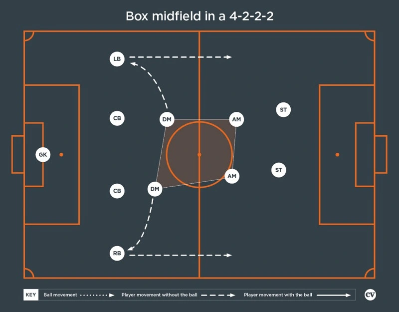 Cấu trúc box midfield bao gồm 4 cầu thủ: 2 tiền vệ trụ (pivot) và 2 tiền vệ tấn công. Họ tạo thành một khối tứ giác tại giữa sân.