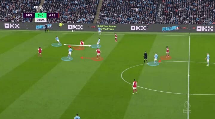 Trong pha bóng tiếp theo, Odegaard che chắn ngay trước mặt Dias. Xhaka và Partey theo Rodri và Gundogan, còn nhiệm vụ kèm De Bruyne được giao lại cho trung vệ Gabriel Magalhaes.