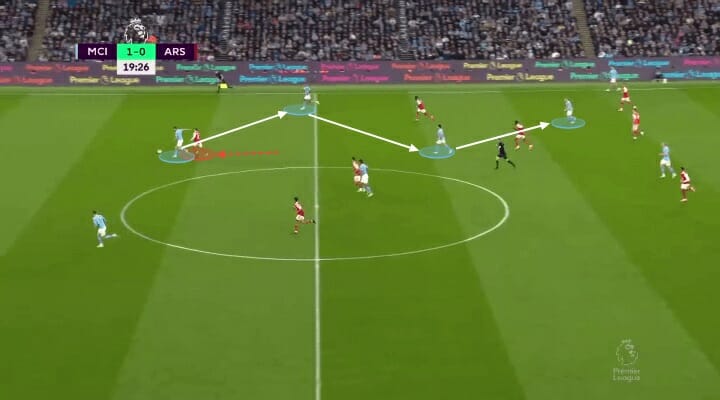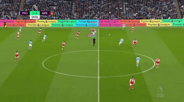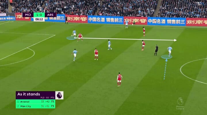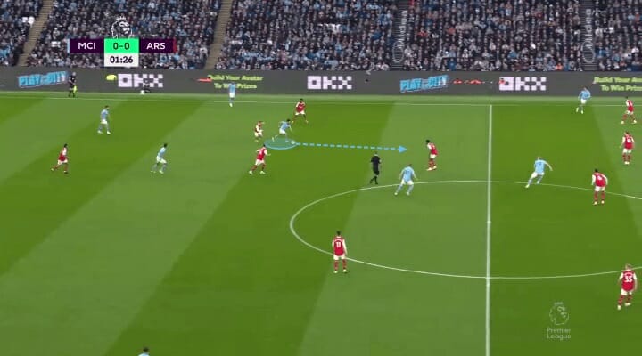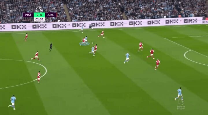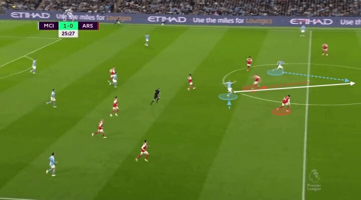 De Bruyne biết rằng đối phương không thể theo anh sang đến tận cánh trái (bởi Gabriel còn phải cùng Rob Holding đối phó với Erling Haaland), thế nên số 17 đã di chuyển ra ngoài và đón bóng từ Dias. Chỉ một đường chuyền, Man City đã đưa bóng xuyên tuyến cho cầu thủ sáng tạo nhất của họ.