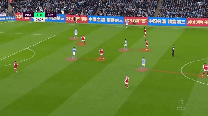Thế nhưng, cấu trúc đó sẽ để hở Kevin De Bruyne. Nếu Partey hoặc Xhaka đứng lại với mục đích canh chừng De Bruyne, thì Arsenal sẽ rơi vào thế bị áp đảo quân số ở phía trên. Như vậy, Gundogan hoặc Rodri có thể nhận bóng từ Dias. Đoàn quân của Pep Guardiola luôn dư ra một người để tạo nên phương án thoát pressing.