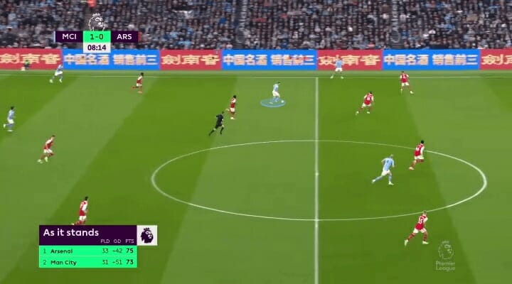 Ví dụ như trong tình huống này, Partey giữ vị trí ở giữa sân để theo dõi De Bruyne. Xhaka chỉ có thể gây áp lực lên một mình Rodri, nên Gundogan không bị ai kèm. Tiền vệ người Đức thậm chí đã dẫn quả bóng đi gần 40 mét, từ sân nhà qua tận khu vực 1/3 cuối sân.