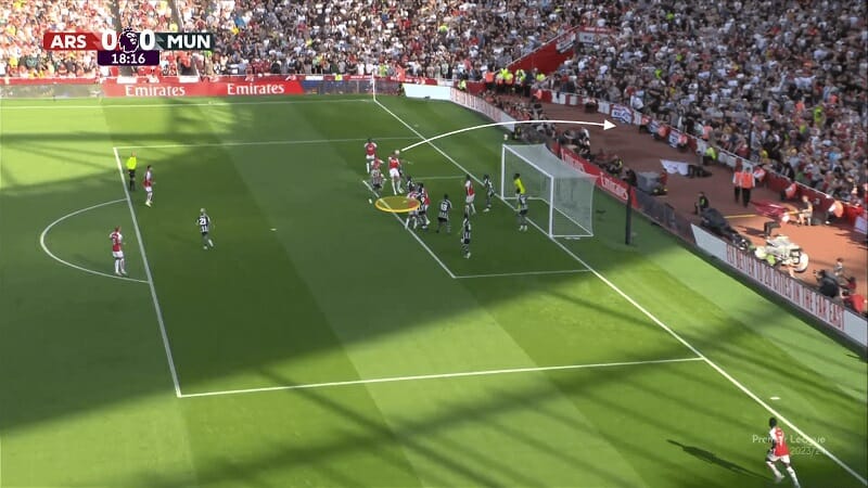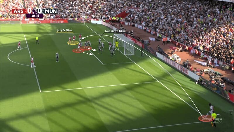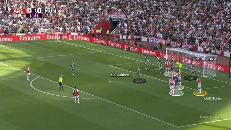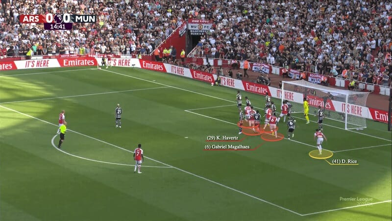 Khi chống phạt góc, Quỷ Đỏ bố trí 4 cầu thủ ở khu vực cột gần. Tuy vậy, họ bị “hớ” vì Pháo Thủ chọn tấn công về phía cột xa. Bộ 3 William Saliba, Kai Havertz và Gabriel Magalhaes bị 3 người bên phía MU theo kèm, nhưng chính họ đã chủ động lôi kéo đối phương ra chỗ khác để tạo khoảng trống cho Rice.