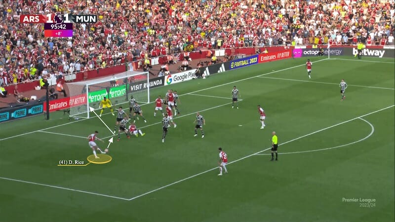 Ở pha phạt góc ngay phút 15, khán giả có thể dễ dàng thấy Rice đứng xa nhất trong số những cầu thủ Arsenal xuất hiện trong vùng cấm địa.