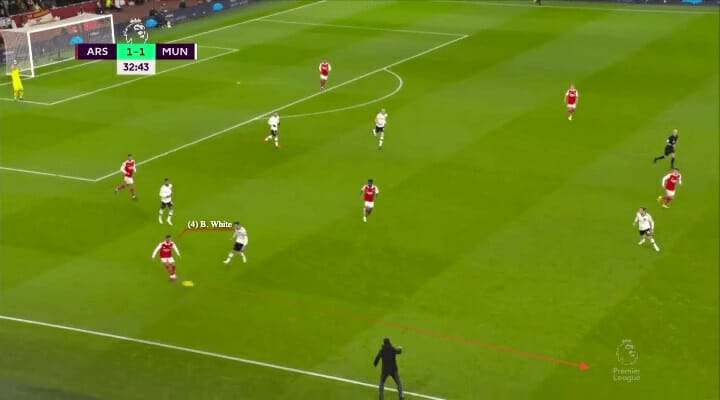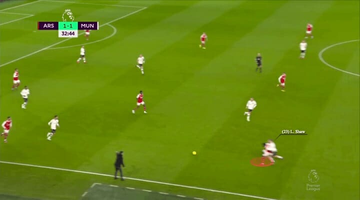 Đầu tiên, hãy xem thử một trường hợp mà “Pháo thủ” không thể làm theo chỉ dẫn của HLV Arteta. Ben White chuyền thẳng lên cho Saka, nhưng Luke Shaw bên phía Manchester United đã đọc được ý đồ này và nhanh chóng áp sát.