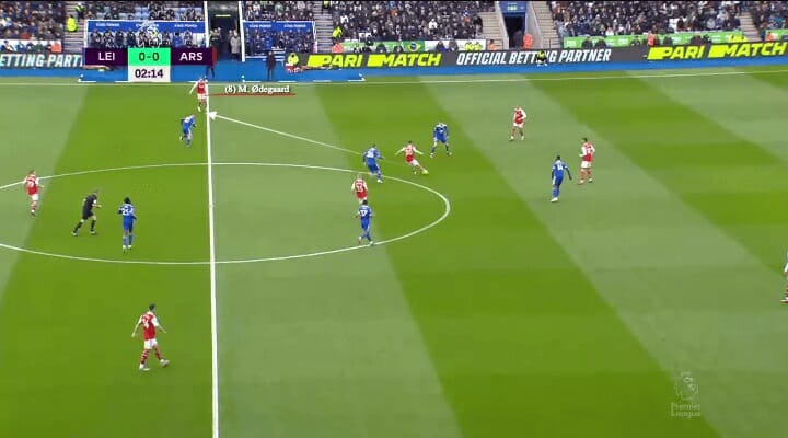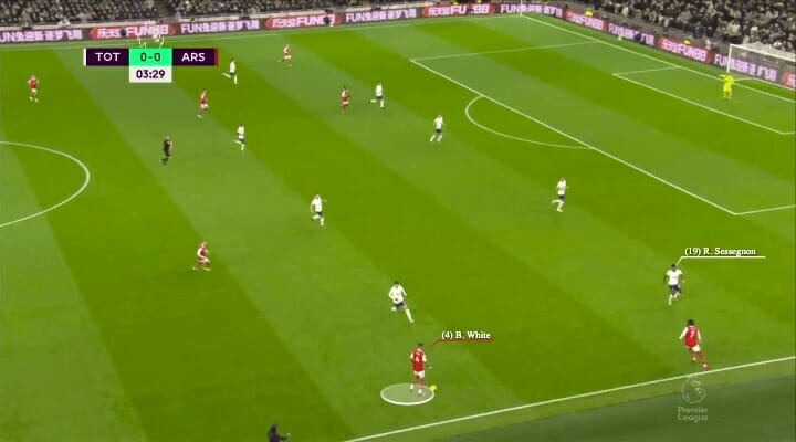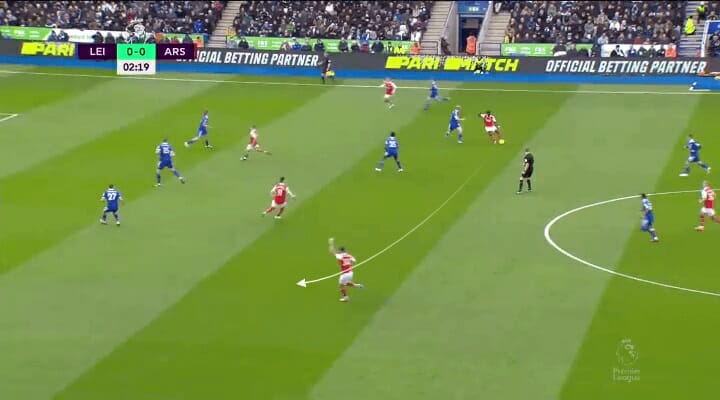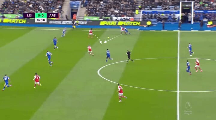 Nhiều đội sẽ gặp khó với tình thế này, nhưng Arsenal có cách giải quyết. Thay vì chuyền thẳng, White chuyền chéo vào hành lang trong, cùng lúc đó Saka tăng tốc.