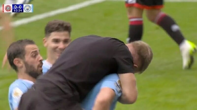 Với sức hút của mình, không ngạc nhiên nếu Haaland gây ra sự phát cuồng cho CĐV. Chính vì vậy, một CĐV Man City không giữ được bình tĩnh để rồi đột nhập xuống sân, nhảy lên người Haaland trước sự ngỡ ngàng của tất cả. Khoảnh khắc quá khích đó khiến người đứng gần Haaland là Bernardo Silva lộ rõ sự ngạc nhiên. Bản thân Haaland cũng bất ngờ vì nhận được sự đối đãi của CĐV sau khi lập công.