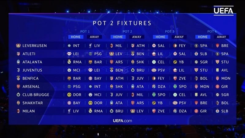 - Nhóm 2: Bayer Leverkusen, Atletico Madrid, Atalanta, Juventus, Benfica, Arsenal, Club Brugge, Shakhtar Donetsk, AC Milan.