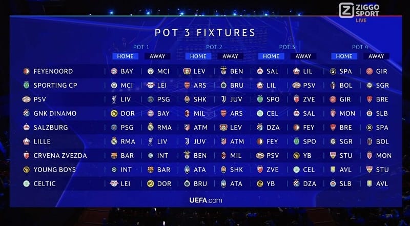 - Nhóm 3: Feyenoord, Sporting Lisbon, PSV, Dinamo Zagreb, Salzburg, Lille, Crvena Zvezda, Young Boys, Celtic.