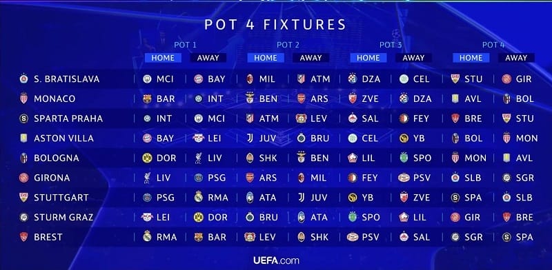- Nhóm 4: Slovan Bratislava, AS Monaco, Sparta Prague, Aston Villa, Bologna, Girona, Stuttgart, Sturm Graz, Brest.
