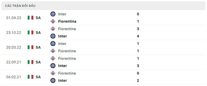 Thành tích đối đầu Fiorentina vs Inter Milan:
