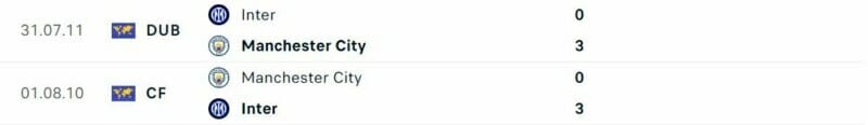 Hai đội chưa từng đụng độ nhau ở các trận cầu chính thức. Lần gần nhất mà Man City đấu với Inter là khi họ hạ đối thủ này 3-0 trong trận giao hữu năm 2011. Do đó, không có quá nhiều dữ kiện về thành tích đối đầu để tham khảo cho trận chung kết tới tại Istanbul.