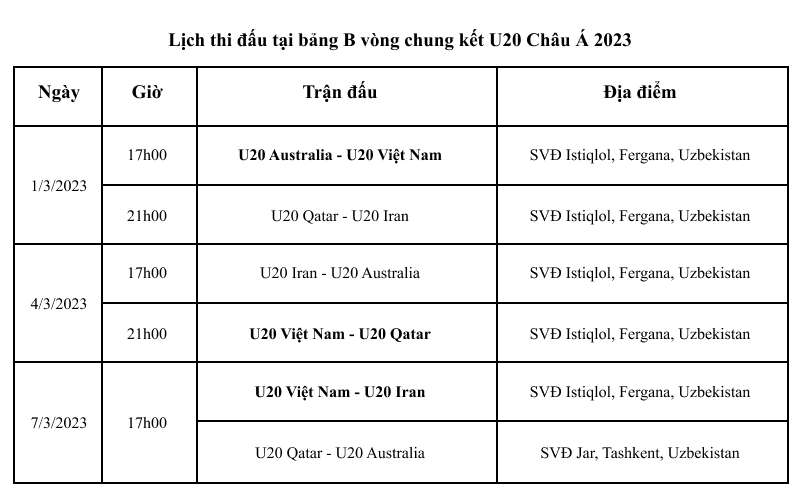 Lịch thi đấu, trực tiếp U20 Việt Nam tại VCK U20 châu Á 2023
