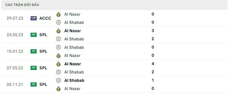 Thành tích đối đầu Al Nassr vs Al Shabab: