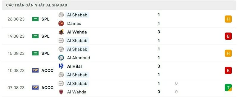 Phía bên kia chiến tuyến, Al Shabab đang có phong độ vô cùng tệ hại. Tính trong 5 trận gần nhất, đoàn quân của HLV Marcel Keizer chỉ có duy nhất 1 chiến thắng trước Al Wahda tại Arab Club Champions Cup. Còn lại, Al Shabab nhận 2 thất bại và 2 trận hòa. Tính riêng đấu trường Saudi Pro League, Ever Banega cùng các đồng đội hiện có 2 điểm và xếp thứ 14 trên bảng xếp hạng.