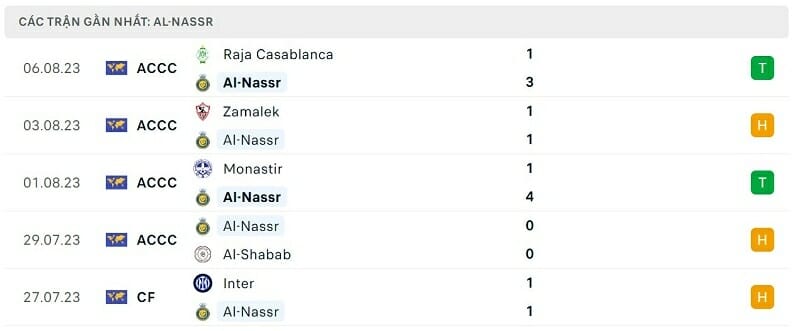 Phía bên kia chiến tuyến, Al Nassr với những Cristiano Ronaldo, Marcelo Brozovic hay Seko Fofana dĩ nhiên là một trong những ứng viên nặng ký cho chức vô địch. Trước khi bước vào Arab Club Champions Cup năm nay, đoàn quân của HLV Luis Castro đã rất tích cực thi đấu giao hữu. Tính từ 11/07 đến 27/07, Al Nassr đã chơi tổng cộng 6 trận đấu. Trong đó, Cristiano Ronaldo và các đồng đội đã gây ấn tượng khi cầm hòa thành công hai ông lớn hàng đầu châu Âu là PSG cùng Inter Milan.