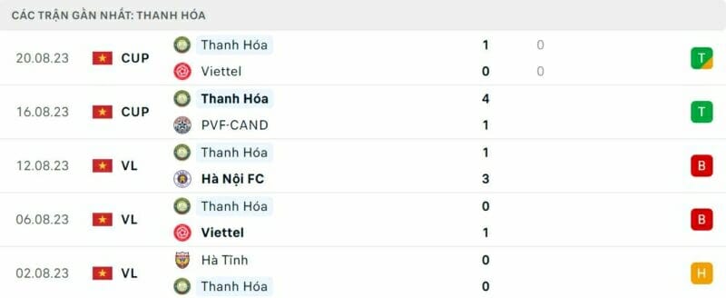 5 trận gần nhất, Thanh Hóa ghi được 7 bàn, nhưng 4 trong số đó là trước đối hạng dưới PVF-CAND. Thành tích của CAHN trong giai đoạn này là 10 bàn và đều trước các đối thủ nằm trong nhóm cạnh tranh ngôi vương V-League 2023.