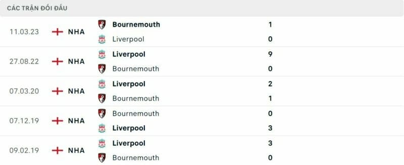 Thành tích đối đầu Liverpool vs Bournemouth: