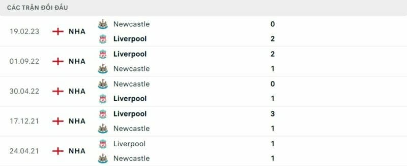 Thành tích đối đầu Newcastle vs Liverpool