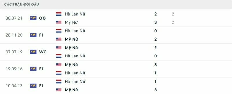 Thành tích đối đầu nữ Mỹ vs nữ Hà Lan: