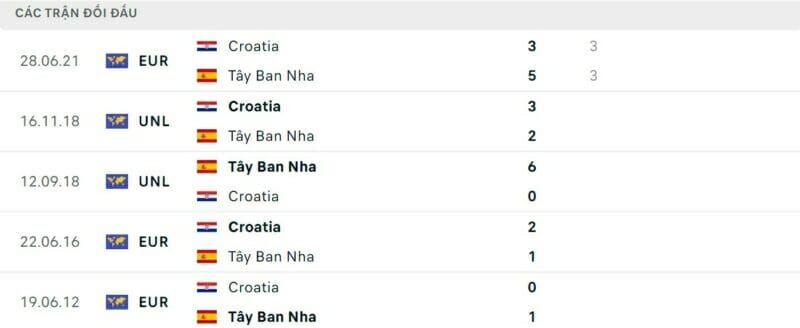 Thành tích đối đầu Tây Ban Nha vs Croatia: