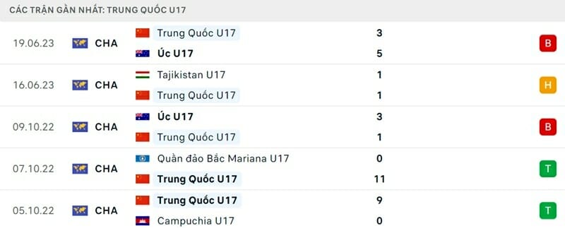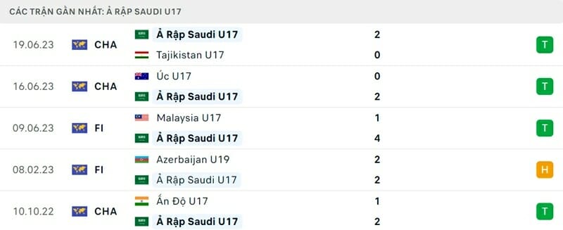 Phong độ gần đây U17 Ả Rập vs U17 Trung Quốc: