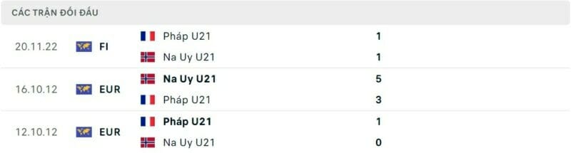 Thành tích đối đầu U21 Na Uy vs U21 Pháp: