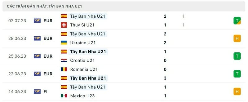 Dù không sở hữu lực lượng đồng đều và có chiều sâu ở tất cả các tuyến như U21 Anh hay U21 Pháp, U21 Tây Ban Nha vẫn được coi là một trong những ứng viên hàng đầu cho chức vô địch U21 Euro 2023. Đoàn quân của HLV Santi Denia có màn chạy đà cực kỳ ấn tượng cho giải đấu trên đất Romania và Georgia. Cụ thể, U21 Tây Ban Nha bất bại trong cả sáu trận giao hữu trước thềm giải đấu.