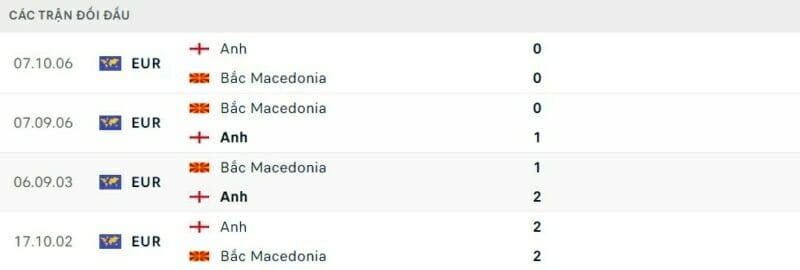 Thành tích đối đầu Anh vs Bắc Macedonia