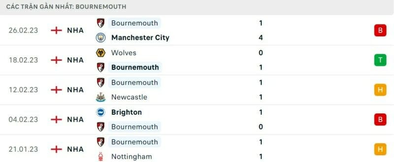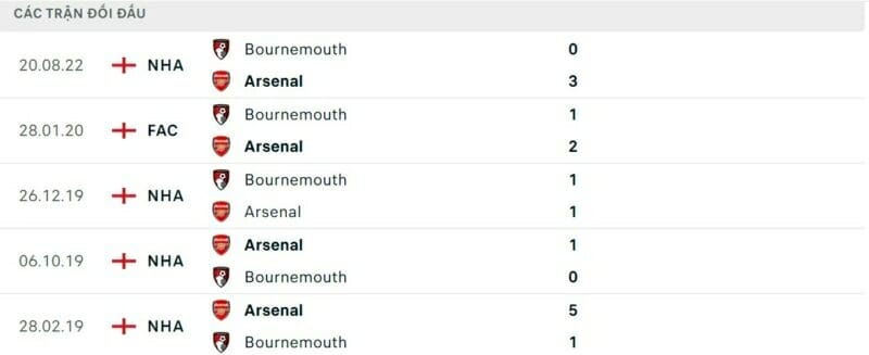 Thành tích đối đầu Arsenal vs Bournemouth: