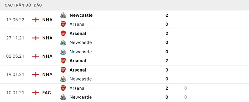 Thành tích đối đầu Arsenal vs Newcastle