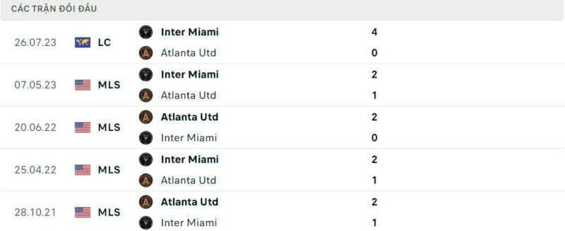 Thành tích đối đầu Atlanta vs Inter Miami: