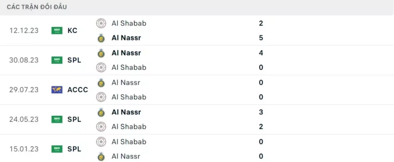 Thành tích đối đầu Al Shabab vs Al Nassr: