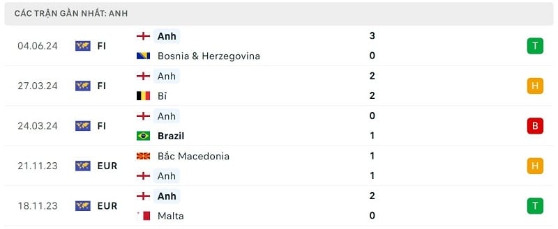 Ở trận giao hữu gần nhất gặp Bosnia, ĐT Anh đã dễ dàng đánh bại đối thủ với tỷ số 3-0. Những người ghi bàn cho Tam Sư lần lượt là Cole Palmer, Trent Alexander-Arnold và Harry Kane. Chiến thắng này thậm chí còn chưa thể hiện được hết thực lực của ĐT Anh bởi HLV Gareth Southgate chưa sử dụng nhiều nhân tố quan trọng như Kyle Walker, John Stones, Declan Rice, Jude Bellingham và Harry Maguire.