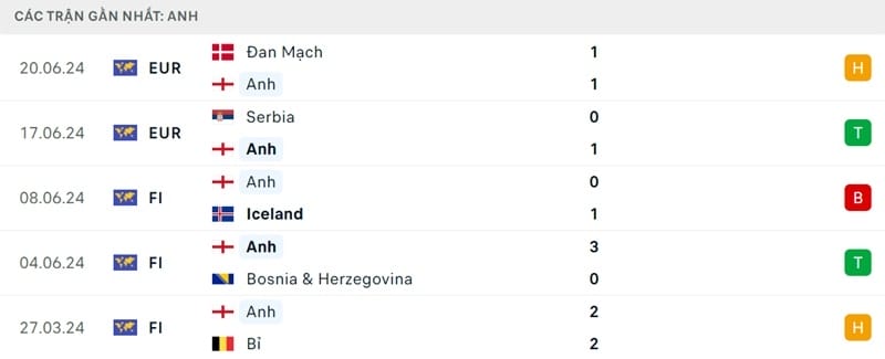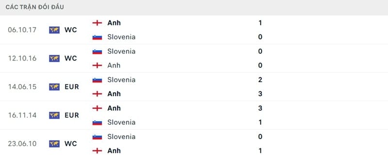 Kết quả đối đầu các trận gần đây nhất của Anh vs Slovenia