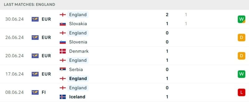 ĐT Anh có bước chạy đà khá tệ trước thềm Euro 2024. Họ chỉ thắng vỏn vẹn 1 trận trong 5 trận đấu trước giải. Phong độ đó phần nào được thể hiện trên đất Đức. Trải qua 4 trận đấu, Tam Sư mới chỉ có 1 lần giành chiến thắng trong 90 phút, bên cạnh 3 trận hòa. Đây là kết quả rất đáng thất vọng với một đội tuyển được xem là ứng cử viên vô địch.