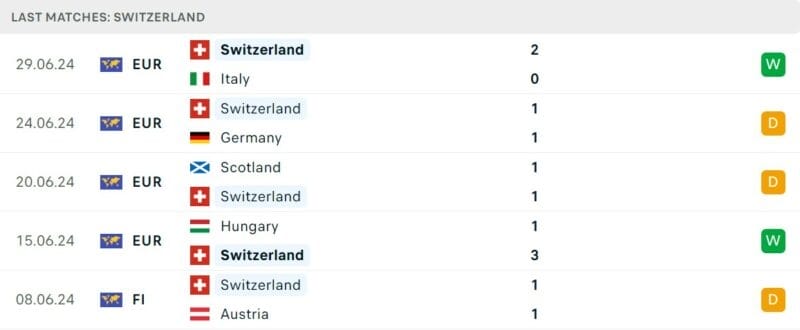 Thụy Sĩ đang có phong độ cao với chuỗi 8 trận bất bại, bao gồm có 4 trận bất bại tại Euro 2024. Trong đó ấn tượng nhất là trận hòa trước Đức và chiến thắng trước đương kim vô địch Italy.