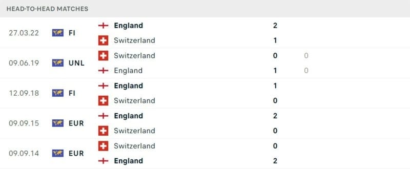 Kết quả đối đầu các trận gần đây nhất của Anh vs Thụy Sĩ